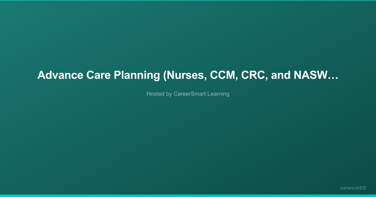 This continuing education course covers advance care planning for healthcare professionals, focusing on facilitating future care planning discussions with patients and families. Participants learn to identify barriers to planning, develop communication techniques for sensitive discussions, and understand the purpose and process of executing advance directives. The course is designed to help professionals support patients in making informed healthcare and personal asset decisions.